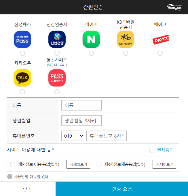 사이트 접속 후 로그인 시 간편인증 선택 후 아래 화면 클릭