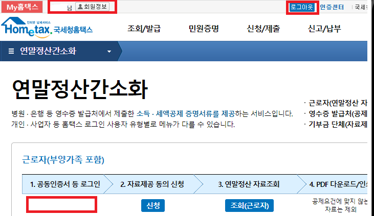 아래와 같이 홈텍스에 로그인이 완료 됩니다. 정상적으로 되면 본인의 이름과 로그아웃이라는 모양을 볼 수 있습니다.